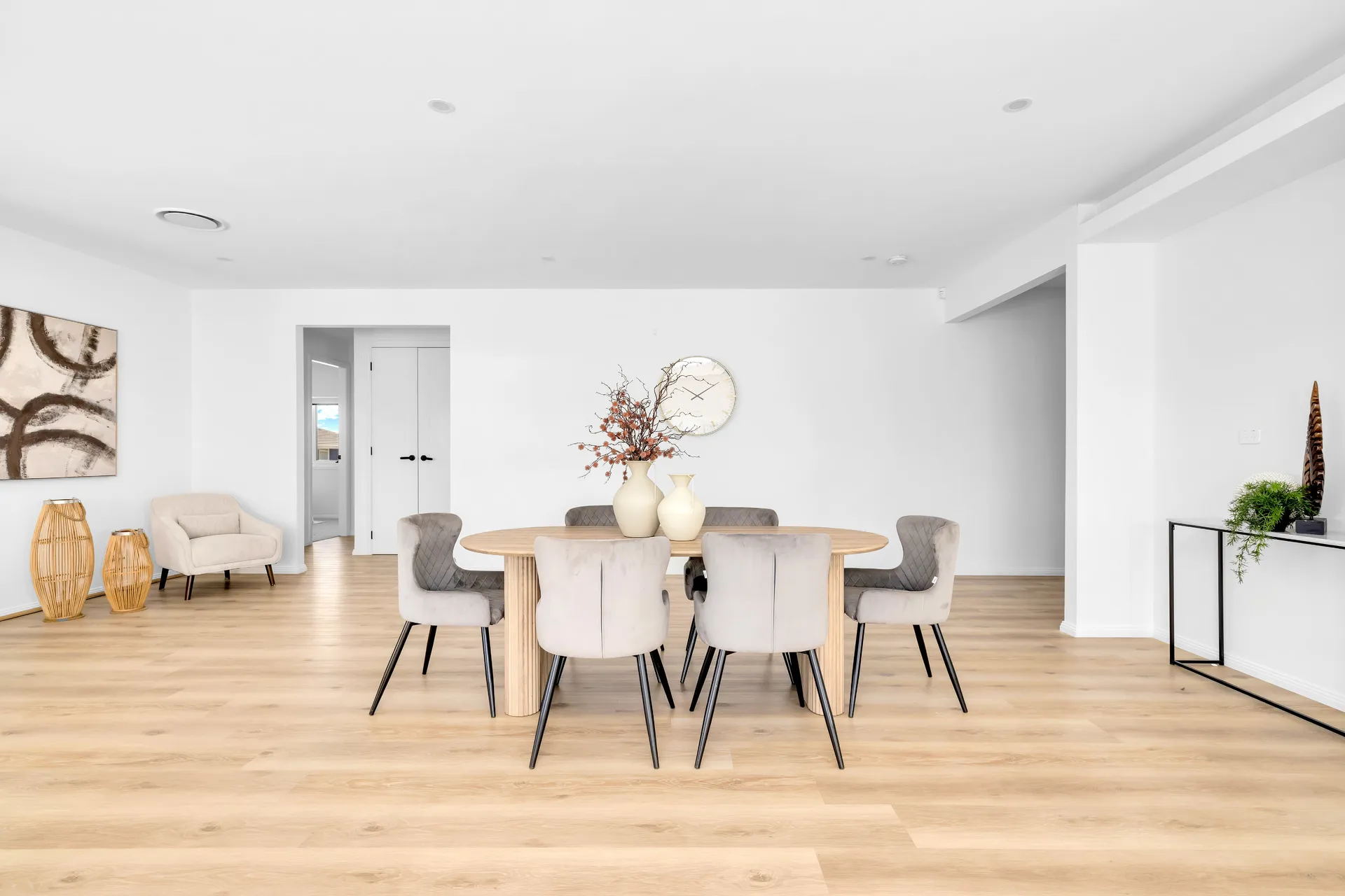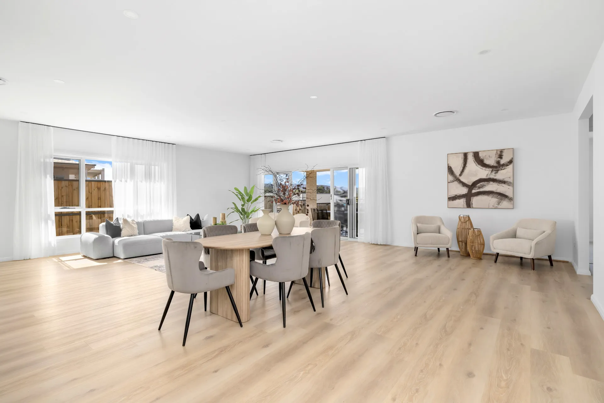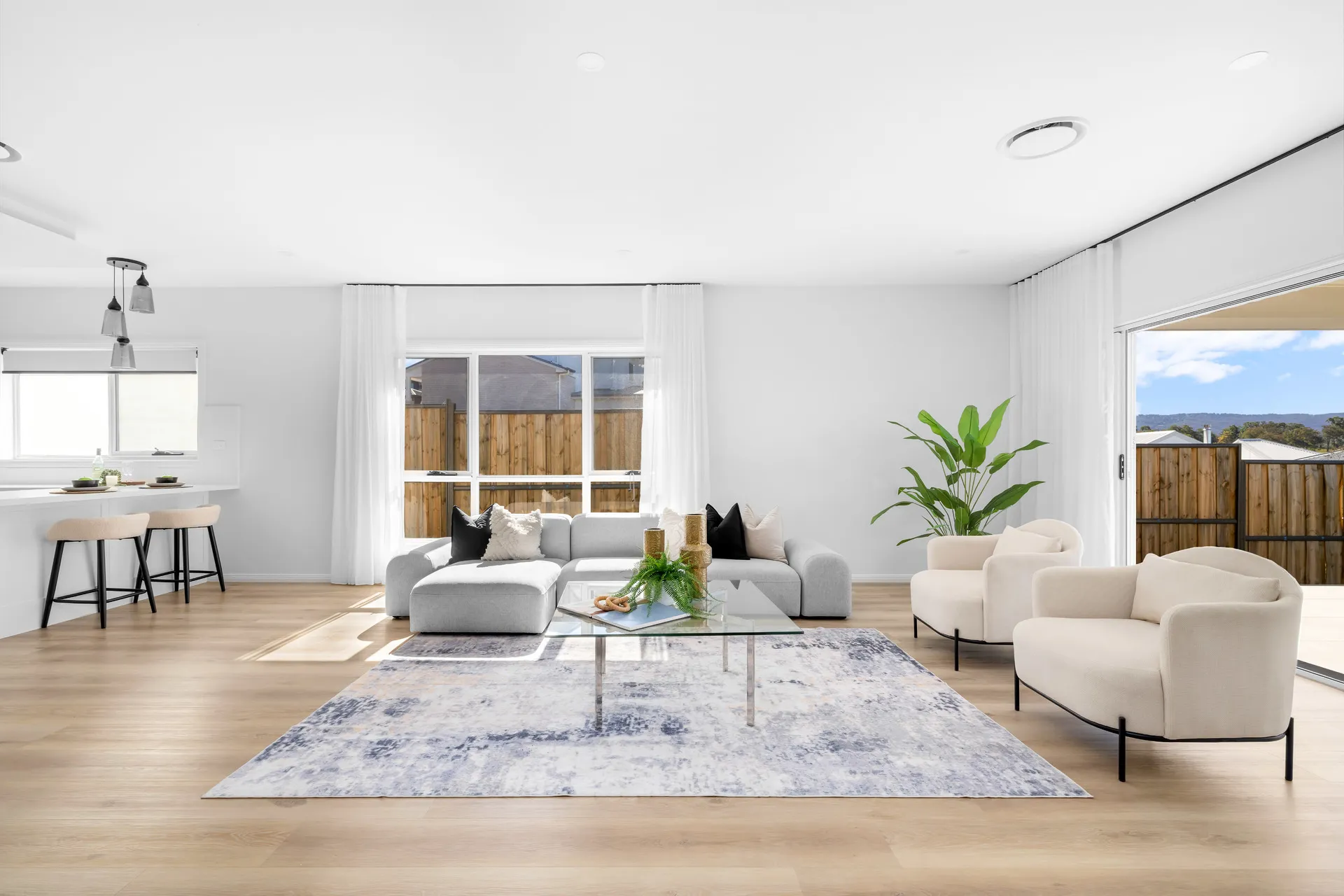 At the heart of the home, the gourmet kitchen with butler’s pantry flows into an expansive open-plan living and dining area, extending to a covered alfresco with outdoor kitchen — ideal for year-round entertaining.